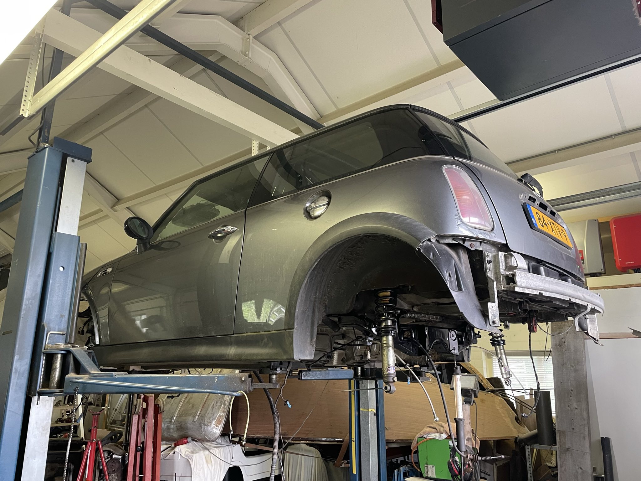 De basis was een leeg gesloopte Cooper S koets, zonder voorkop en achterbumper, die ik al een paar jaar had staan.