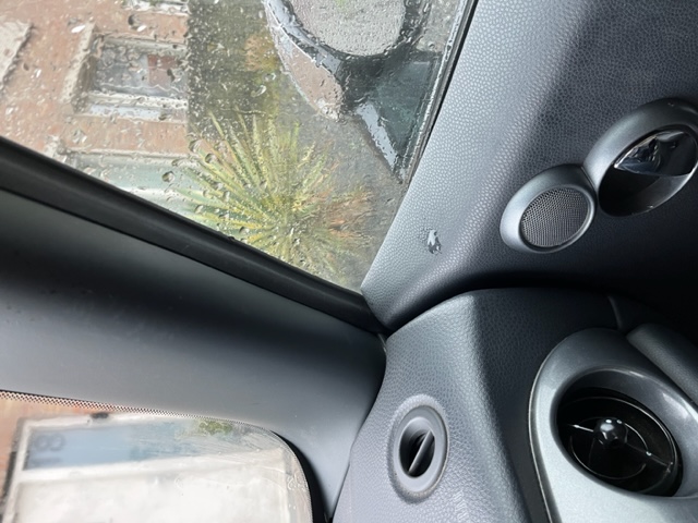 Tijdens de rit naar huis (in de regen) merkte ik dat er water bij het rechter raamrubber naar binnen drupte. Vandaag stond de auto ook weer even buiten en lekte er ook een beetje water naar binnen (zie foto's). Zou het met de het rubber of dat kanaal te maken kunnen hebben?